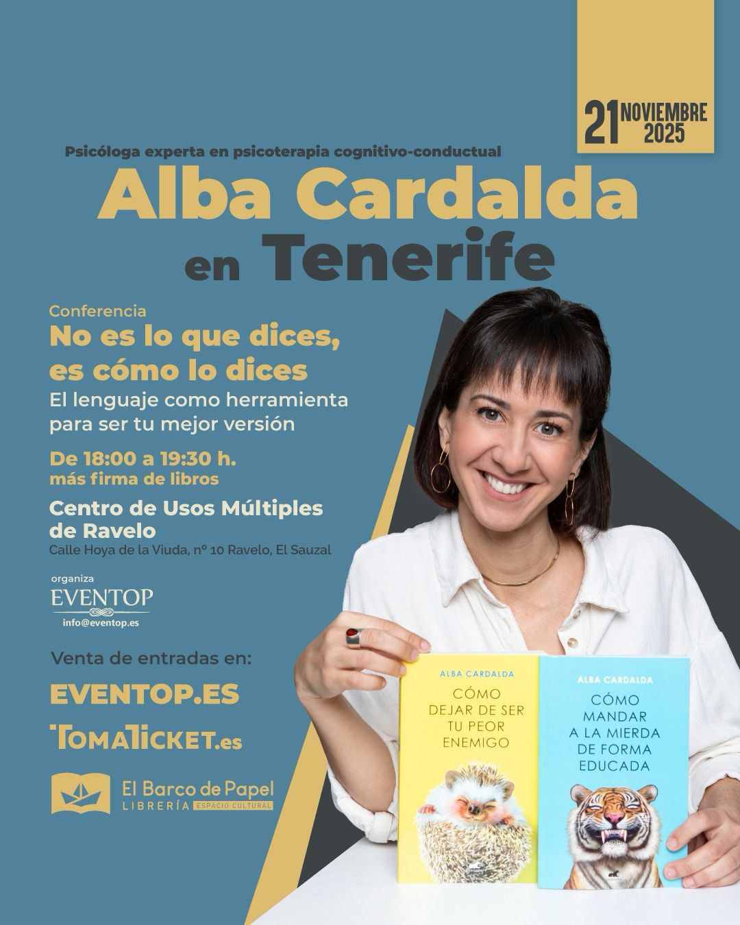 Y para cerrar el programa, charlamos con Alba Cardalda, quien nos adelanta los detalles de la próxima conferencia que tendrá lugar el 21 de noviembre en El Sauzal (Tenerife), titulada: “No es lo que dices, es cómo lo dices”. Un encuentro que pondrá el foco en la importancia de la comunicación efectiva y el poder del lenguaje no verbal en nuestras relaciones personales y profesionales.